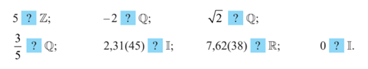 \(\begin{array}{l}5 \in \mathbb{Z};\,\,\,\,\,\,\,\,\,\,\,\,\,\,\, – 2 \in \mathbb{Q};\,\,\,\,\,\,\,\,\,\,\,\,\,\sqrt 2  \notin \mathbb{Q};\\\frac{3}{5} \in \mathbb{Q};\,\,\,\,\,\,\,\,\,\,\,\,2,31\left( {45} \right) \notin I\,\,\,\,\,\,7,62\left( {38} \right) \in \mathbb{R};\,\,\,\,0 \notin I\end{array}\)