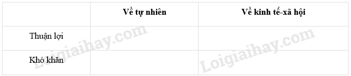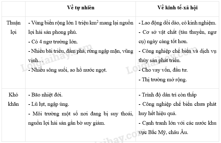 Dựa vào kiến thức trong SGK Địa lí 12, hãy điền vào bảng dưới đây các điều kiện thuận lợi và khó khăn để phát triển ngành thủy sản của nước ta.