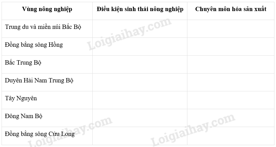 Căn cứ vào kiến thức trong SGK Địa lí 12, hãy điền các điều kiện sinh thái nông nghiệp và hướng chuyên môn hóa sản xuất của từng vùng nông nghiệp vào bảng dưới đây: