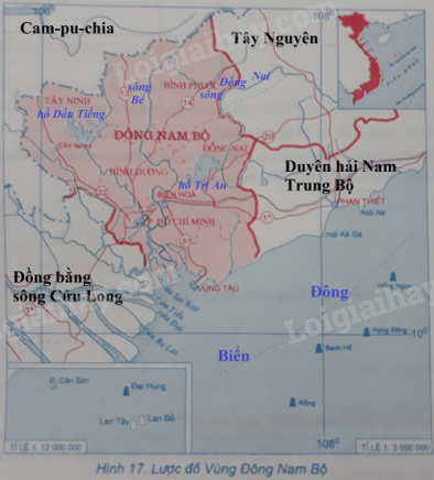 Dựa vào nội dung SGK, Atlat địa lí Việt Nam và đối chiếu với lược đồ dưới đây, em hãy điền tên các vùng tiếp giáp với Đông Nam Bộ: