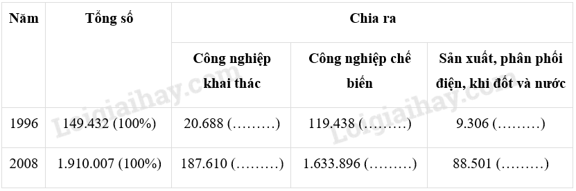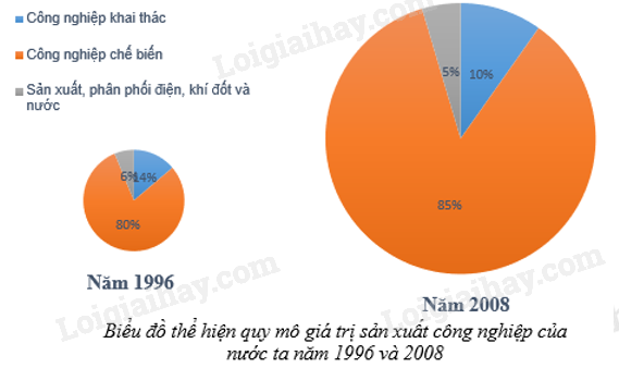 Vẽ biểu đồ thể hiện quy mô giá trị sản xuất công nghiệp của nước ta và cơ cấu của nó phân theo 3 nhóm ngành năm 1996 và năm 2008 (trước khi vẽ biểu đồ, hãy xử lí số liệu và điền vào bảng trên).