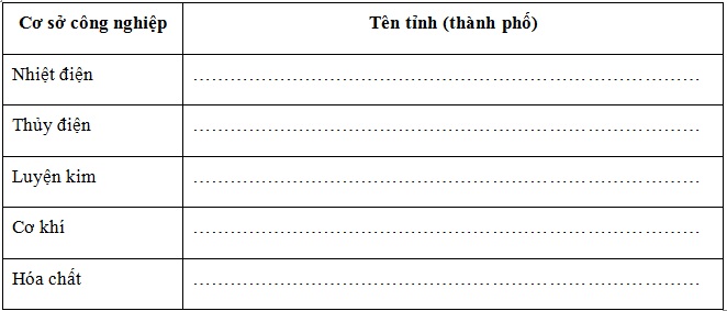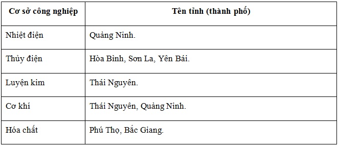 Giải bài 1 trang 45 vở bài tập Địa lí 9, Dựa hình 18.1 trong SGK, hãy xác định tên các tỉnh (thành phố) trong vùng có các cơ sở công nghiêp quan trọng và điền vào bảng sau: