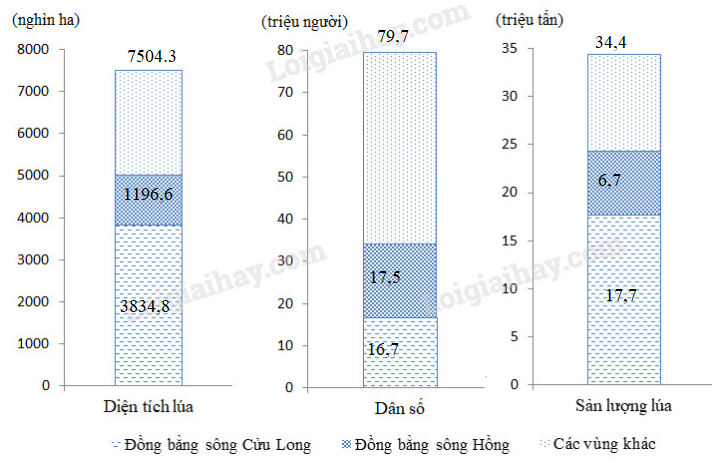 Dựa vào số liệu về diện tích lúa, dân số và sản lượng lúa của đồng bằng sông Hồng, đồng bằng sông Cửu Long và cả nước năm 2002 dưới đây, hãy vẽ biểu đồ cột chồng thể hiện rõ số liệu đó.