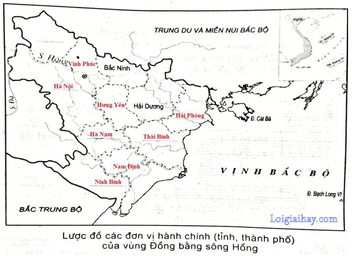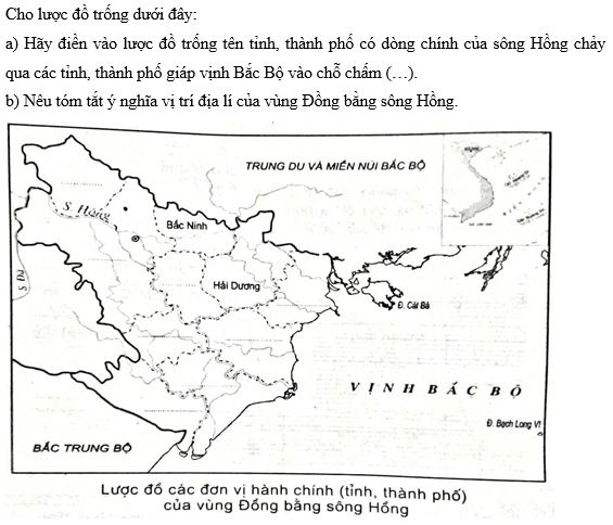 Giải bài 1 trang 49 vở bài tập Địa lí 9, Cho lược đồ trống dưới đây: a) Hãy điền vào lược đồ trống tên tỉnh, thành phố có dòng chính của sông Hồng chảy qua các tỉnh, thành phố giáp vịnh Bắc Bộ vào chỗ chấm (…). b) Nêu tóm tắt ý nghĩa vị trí địa lí của vùng Đồng bằng sông Hồng.