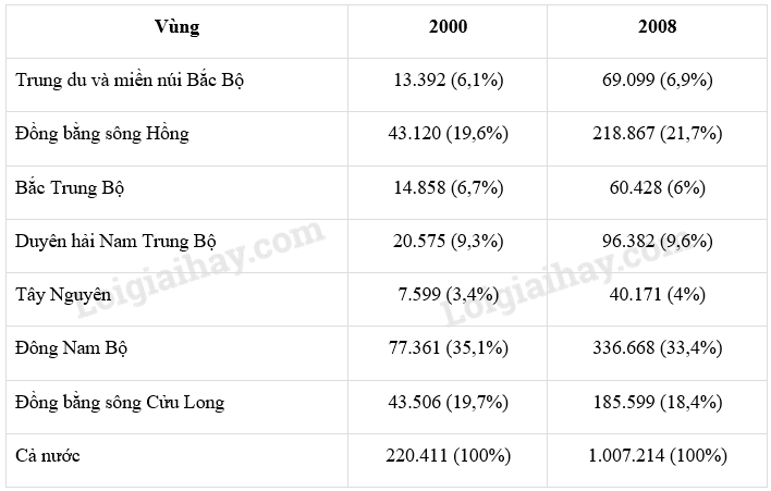 Giải bài 1 trang 55 tập bản đồ Địa lí 12, Dựa vào bảng số liệu đã cho, hãy vẽ biểu đồ thể hiện quy mô tổng mức bán lẻ hàng hóa, doanh thu dịch vụ tiêu dùng và cơ cấu của nó phân theo vùng của nước ta năm 2000 và 2008.