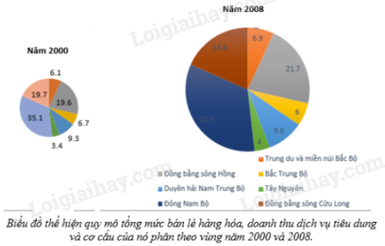 Dựa vào bảng số liệu đã cho, hãy vẽ biểu đồ thể hiện quy mô tổng mức bán lẻ hàng hóa, doanh thu dịch vụ tiêu dùng và cơ cấu của nó phân theo vùng của nước ta năm 2000 và 2008.