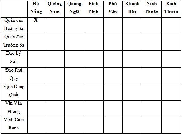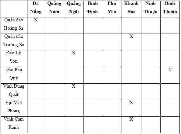 Dựa vào hình 25, đánh dấu (X) vào các đảo và các vịnh vào các cột thuộc các tỉnh, thành phố Duyên hải Nam Trung Bộ trong bảng sau: