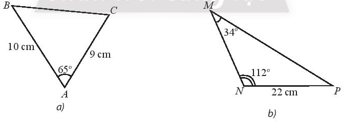 \(\begin{array}{l}B{C^2} = A{B^2} + A{C^2} – 2AB.AC.\cos A\\ = {10^2} + {9^2} – 2.10.9.\cos 65^\circ  \simeq 104,93\\ \Rightarrow BC \simeq \sqrt {104,96}  \simeq 10,24\end{array}\)