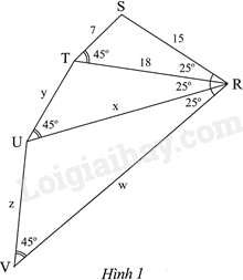 Tam giác STR và tam giác UVR có: \(\widehat {STR} = \widehat V = {45^0},\widehat {SRT} = \widehat {VRU} = {25^0}\)  nên $\Delta STR\backsim \Delta UVR\left( g.g \right)$, do đó \(\frac{{ST}}{{UV}} = \frac{{TR}}{{VR}} = \frac{{SR}}{{UR}}\), hay \(\frac{7}{z} = \frac{{18}}{{\rm{w}}} = \frac{{15}}{{21,6}}\)