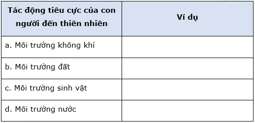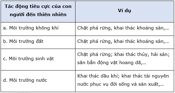 Dựa vào nội dung chương 4, 5, 6, 7 trong SGK, em hãy tìm các hoạt động khai thác tài nguyên gây tổn hại đến thiên nhiên và ô nhiễm môi trường theo gợi ý như sau: