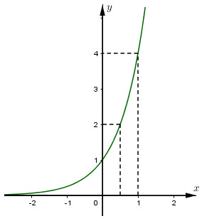 Đồ thị nằm hoàn toàn phía trên trục hoành, cắt trục tung tại điểm \((0;1)\), đi qua điểm \((1;4)\) và qua các điểm \((\dfrac{1}{2}; 2)\), \((-\dfrac{1}{2}; \dfrac{1}{2})\), \((-1; \dfrac{1}{4})\).