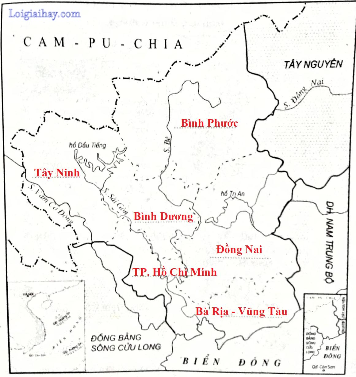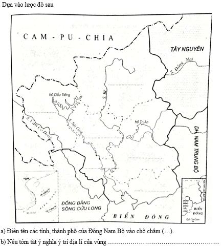 Giải bài 1 trang 77 vở bài tập Địa lí 9, Dựa vào lược đồ sau a) Điền tên các tỉnh, thành phố của Đông Nam Bộ vào chỗ chấm (…). b) Nêu tóm tắt ý nghĩa ý trí địa lí của vùng