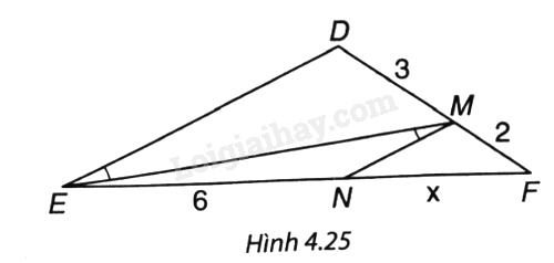 ∆DEF có MN // DE nên theo định lí Thales ta có: \(\frac{{FN}}{{EN}} = \frac{{FM}}{{DM}}\) hay \(\frac{x}{6} = \frac{2}{3}\) suy ra x = 4.
