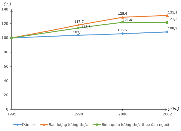 Biểu đồ tốc độ tăng dân số, sản lượng lương thực và bình quân lương thực theo đầu người ở đồng bằng sông Hồng giai đoạn 1995 – 2002 (%)