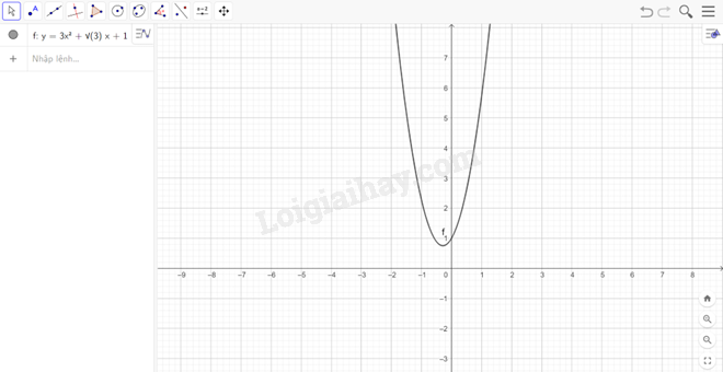c) Đồ thị hàm số \(y = 3{x^2} + \sqrt 3 x + 1\): Ta nhập hàm số \(y = 3{x^2} + \sqrt 3 x + 1\) vào ô lệnh, màn hình sẽ hiển thị đồ thị của hàm số cần vẽ: