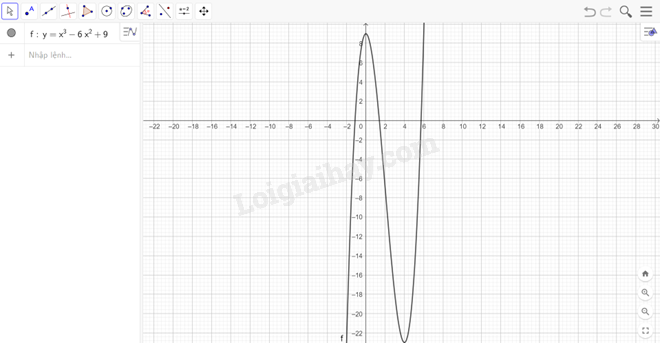 Đồ thị hàm số \(y = {x^3} – 6{x^2} + 9\): Ta nhập hàm số \(y = {x^3} – 6{x^2} + 9\) vào ô lệnh, màn hình sẽ hiển thị đồ thị của hàm số cần vẽ: