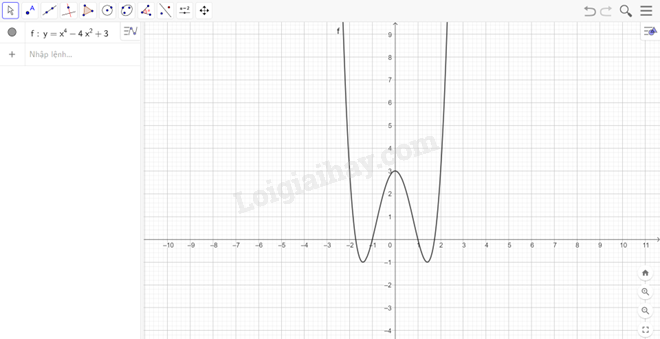 Đồ thị hàm số \(y = {x^4} – 4{x^2} + 3\): Ta nhập hàm số \(y = {x^4} – 4{x^2} + 3\) vào ô lệnh, màn hình sẽ hiển thị đồ thị của hàm số cần vẽ: