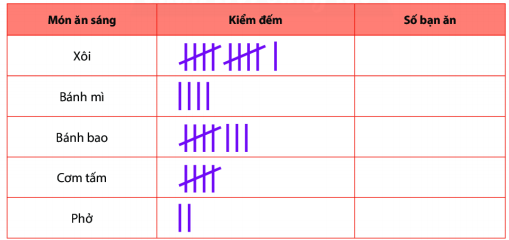 Lan muốn tìm hiểu về thức ăn sáng nay của các bạn trong lớp. Em hãy giúp Lan hoàn thành công việc.