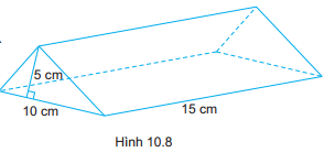 Diện tích đáy của hình lăng trụ là: \(S = \dfrac{1}{2} \cdot 10 \cdot 5 = 25\left( {c{m^2}} \right)\)