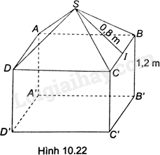 Một cái lều đồ chơi cho trẻ em có hình dạng gồm một hình lập phương có cạnh dài 1,2m và nóc lều là một hình chóp tứ giác đều có cạnh đáy bằng 1,2m, trung đoạn bằng 0,8m (H.10.22). Tính diện tích vải để phủ nóc và các mặt bên của lều (coi các mép nối không đáng kể).
