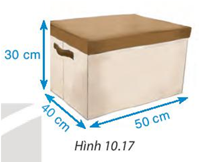 Một chiếc hộp đựng đồ đa năng có dạng hình hộp chữ nhật với khung bằng thép, bên ngoài phủ vải và kích thước như hình 10.17 a) Tính thể tích của hộp. b) Tính diện tích vải phủ bề mặt ngoài của chiếc hộp