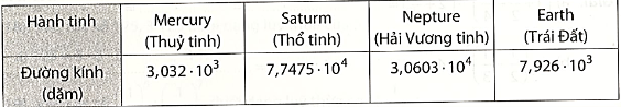 Bảng dưới đây cho ta kích thước đường kính của một số hành tinh (tính theo dặm, dặm là đơn vị đo độ dài của nước Anh và Mỹ, 1 dặm =1609,344 m)