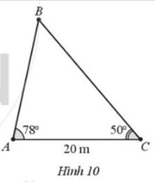 Một cây cao bị nghiêng so với mặt đất góc 780. Từ vị trí C cách gốc cây 20 m, người ta tiến hành đo đạc và thu được kết quả \(\widehat {ACB} = {50^0}\) với B là vị trí ngọn cây (Hình 10). Tính khoảng cách từ gốc cây (điểm A) đến ngọn cây (điểm B) (làm tròn kết quả đến hàng phần mười theo đơn vị mét)