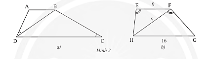 b) Cho hình thang \(EFGH\left( {FF//GH} \right),\widehat {HEF} = \widehat {HFG},EF = 9m,GH = 16m\) (Hình 2b).