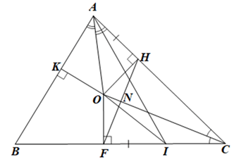 Cho tam giác ABC có ba góc nhọn, AB < AC < BC. Các tia phân giác của góc A và góc C cắt nhau tại O. Gọi F là hình chiếu của O trên BC; H là hình chiếu của O trên AC. Lấy điểm I trên đoạn FC sao cho FI = AH. Chứng minh: