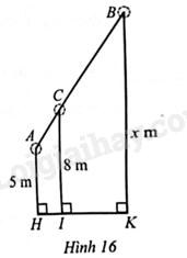 Ở một nhà máy, người ta dùng một băng chuyền để chuyển nguyên vật liệu. Ba vòng quay \(A,B,C\) của băng chuyền đặt cách mặt đất ở các độ cao lần lượt là \(AH = 5\) (m), \(CI = 8\) (m), \(BK = x\) (m) (Hình 16).
