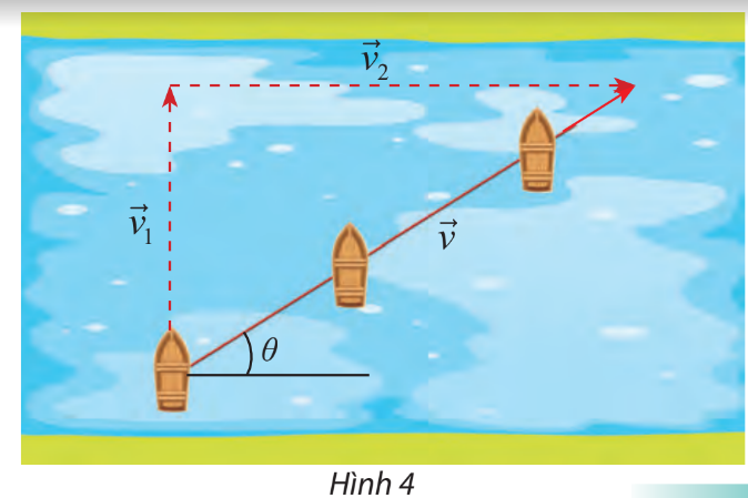 Suy ra góc lệch giữa hướng di chuyển của thuyền và bờ là \(\left( {\overrightarrow v ,\overrightarrow {{v_2}} } \right)\)