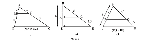 \(\frac{{HP}}{{HI}} = \frac{{HQ}}{{HK}} \Leftrightarrow \frac{x}{8} = \frac{{6,5}}{{6,5 + 3,5}} \Rightarrow x = \frac{{8.6,5}}{{\left( {6,5 + 3,5} \right)}} = 5,2\)