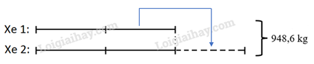 Vẽ sơ đồ số hàng ở hai xe: chuyển \(50\%  = \frac{1}{2}\) số hàng ở xe thứ nhất sang xe thứ hai thì xe thứ hai chở gấp 3 lần xe thứ nhất. Tổng là 948,6 kg hàng hoá.