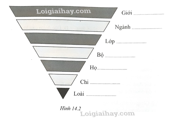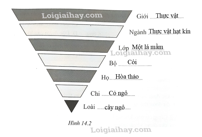 Viết tên các cấp bậc phân loại của cây ngô vào chỗ  ……… trong hình  14.2 dựa vào gợi ý sau: Cói, Một lá mầm, Thực vật, Thực vật hạt kín, Hòa thảo, Cỏ ngô, cây ngô.