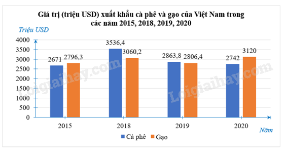 b) Biểu đồ cột kép biểu diễn giá trị (triệu USD) xuất khẩu cả phê và gạo của Việt Nam trong các năm 2015, 2018, 2019, 2020: