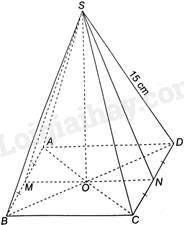 Cho hình chóp tứ giác đều S.ABCD có cạnh đáy \(AB = 10cm,\) cạnh bên \(SD = 15cm\). Gọi O là giao điểm của AC và BD, M và N lần lượt là trung điểm của AB và CD.
