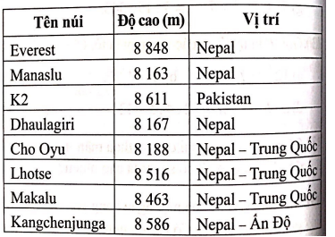 b)    Tám ngọn núi trong danh sách theo thứ tự độ cao giảm dần là: Everest, K2, Kangchenjunga, Lhotse, Makalu, Cho Oyu, Dhaulagiri, Manaslu.