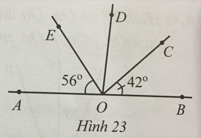 Ta có góc AOB bằng 180° nên \(\widehat {COE} = 180^\circ – \widehat{AOE}-\widehat{BOC}= 180^\circ – 56^\circ  – 42^\circ  = 82^\circ \).