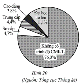 a) Trong năm 2020, phần trăm lực lượng lao động không có trình độ CMKT, trình độ sơ cấp, trình độ trung cấp, trình độ cao đẳng, trình độ đại học trở lên lần lượt là: 76,0%, 4,7%, 4,4%, 3,8%, 11,1 %