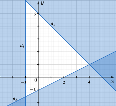 b) Ta có b đường thẳng: \({d_1}:x + y = 5;{d_2}:x – 2y = 2;{d_3}:x =  – 1\)