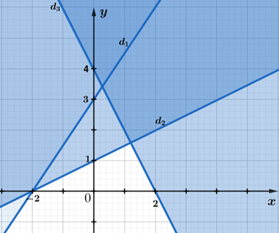 +) Lấy O(0; 0) không thuộc đường thẳng d3 có 2.0 + 0 < 4. Do đó miền nghiệm của bất phương trình 2x + y < 4 là nửa mặt phẳng chứa điểm O(0; 0) và không kể bờ là đường thẳng d3.