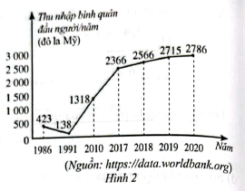Biểu đồ đoạn thẳng ở Hình 2 biểu diễn thu nhập bình quân đầu người/ năm của VN ở một số năm trong giai đoạn từ 1986 đến 2020.