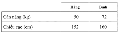Để đánh giá thể trạng của một người, người ta thưởng dùng chỉ số BMI. Chỉ số BMI được tính bằng công thức: BMI = \(\frac{m}{{{h^2}}}\), (chỉ số này thường được làm tròn đến hàng phần mười) với m là cân nặng (tính theo ki-lô-gam) và h là chiều cao (tính theo mét). Nếu 18,5 ≤  BMI  ≤ 22,9 thì được coi là thể trạng bình thường đối với người trên 20 tuổi. Hai chị Hằng và Bình (25 tuổi) có các số đo cân nặng và chiều cao như sau: