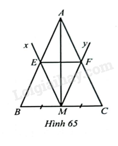 Cho tam giác \(ABC\) cân tại \(A\), có \(M\) là trung điểm của \(BC\). Kể tia \(Mx\) song song với \(AC\) cắt \(AB\) tại \(E\) và tia \(My\) song song với \(AB\) cắt \(AC\) tại \(F\). Chứng minh: