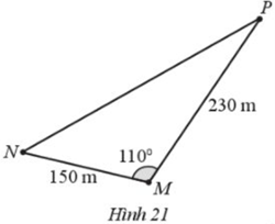 Gia đình bạn An sở hữu một mảnh đất hình tam giác. Chiều dài của hàng rào MN là 150 m, chiều dài của hàng rào MP là 230 m. Góc giữa hai hàng rào MN MP là 1100 (Hình 21)