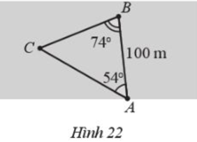 Hai người AB cùng quan sát một con tàu đang neo đậu ngoài khơi tại vị trí C. Người A đứng trên bờ biển, người B đứng trên một hòn đảo cách bờ một khoảng AB= 100 m. Hai người tiến hành đo đạc và thu được kết quả: \(\widehat {CAB} = {54^0},\widehat {CBA} = {74^0}\) (Hình 22). Hỏi con tàu cách hòn đảo bao xa (làm tròn kết quả đến hàng phần mười theo đơn vị mét)?