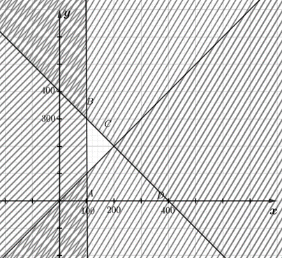 Từ đó ta có hệ bất phương trình: \(\left\{ {\begin{array}{*{20}{c}}{x + y \le 400}\\{x \ge 100}\\{x – y \le 0}\end{array}} \right.\)