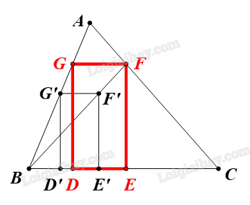 Dựng hình chữ nhật D’E’F’G’ có \(\;E’F'{\rm{ }} = {\rm{ }}2D’E’\) và hai đỉnh D’, E’ thuộc BC.