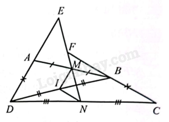 Do đó \(\widehat {IMN} = \widehat {INM}\). Lại có \(\widehat {IMN} = \widehat {AEM}\) (hai góc đồng vị, \(IM//AE\)). Suy ra \(\widehat {INM} = \widehat {AEM}\). Mặt khác \(\widehat {INM} = \widehat {MDB}\) (hai góc so le trong, \(IN//FB\)). Suy ra \(\widehat {AEM} = \widehat {MFB}\).