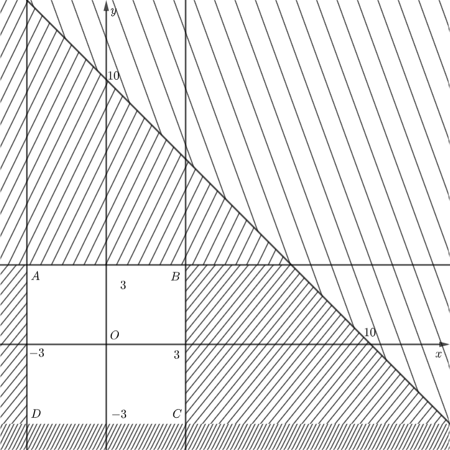 Miền nghiệm của hệ bất phương trình \(\left\{ {\begin{array}{*{20}{c}}{x + y \le 10}\\{ – 3 \le y \le 3}\\{ – 3 \le x \le 3}\end{array}} \right.\) là: